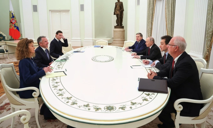 Khi tiếp đón phái đoàn,Tổng thống Putin mỉm cười hỏi thăm về chuyến đi dạo. "Đây là thành phố tráng lệ",ông Witkoff đáp. Ngồi cạnh ông Putin là trợ lý đối ngoại Yuri Ushakov và đặc phái viên Kirill Dmitriev. Hai bên đều có người phiên dịch.