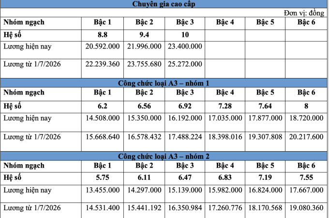 Bảng lương công chức dự kiến từ 1/7/2026 như sau: