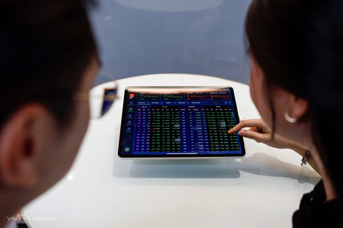 Nhà đầu tư đang theo dõi bảng điện tử tại trụ sở một công ty chứng khoán ở TP HCM. Ảnh: An Khương