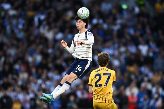 Tiền vệ Archie Gray (trái) đánh đầu trong trận gặp Brighton. Ảnh: Reuters