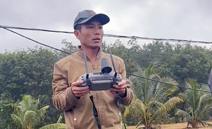 Anh Hoàng Văn Thiện,ở xã Ea Ô đang điều khiển drone cứu người,sáng 21/11. Ảnh: Nhân vật cung cấp