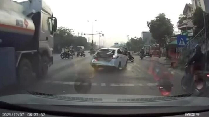 Tình huống giao thông: Tại ngã tư,đèn giao thông chuyển màu,chiếc xe con dừng chờ trước vạch kẻ bất ngờ bị xe bồn phía sau húc mạnh văng ra giữa đường. Chiếc sedan bị vỡ nát đuôi,may mắn tài xế không bị thương.