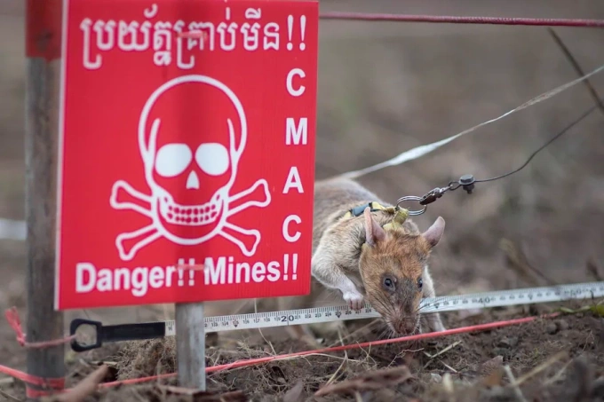 Một con chuột chuyên dò tìm bom mìn tại Campuchia. Ảnh: Apopo