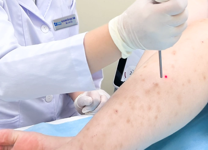 Bác sĩ dùng laser pico điều trị tình trạng tăng sắc tố sau viêm cho chị Mai. Ảnh: Bệnh viện Đa khoa Tâm Anh